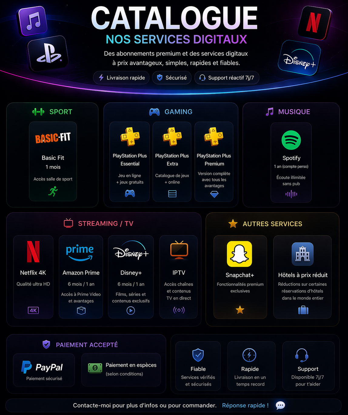 Accédez rapidement à Basic Fit, Spotify 1 an (compte perso), PlayStation Plus Essential, PlayStation Plus Extra, PlayStation Plus Premium, IPTV, Netflix, Amazon Prime, ChatGPT Plus, Disney+, Gemini, Hôtels à prix réduit.
